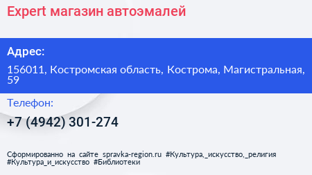 Expert, магазин автоэмалей по адресу 156011, Костромская область, Кострома, Магистральная, 59 в дальнейшем Организация, размещена в следующих категориях: