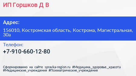 ИП Горшков Д.В. по адресу 156010, Костромская область, Кострома, Магистральная, 30а в дальнейшем Организация, размещена в следующих категориях: