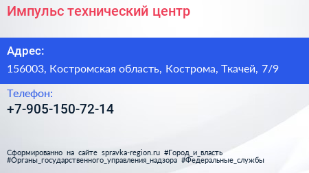 Импульс, технический центр по адресу 156003, Костромская область, Кострома, Ткачей, 7/9 в дальнейшем Организация, размещена в следующих категориях: