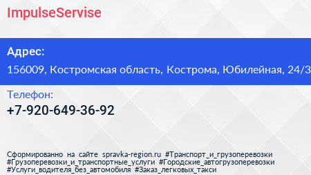 ImpulseServise по адресу 156009, Костромская область, Кострома, Юбилейная, 24/3 в дальнейшем Организация, размещена в следующих категориях: