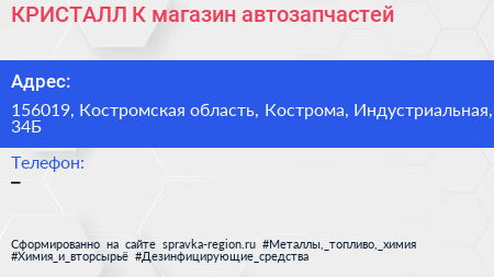 КРИСТАЛЛ-К, магазин автозапчастей по адресу 156019, Костромская область, Кострома, Индустриальная, 34Б в дальнейшем Организация, размещена в следующих категориях: