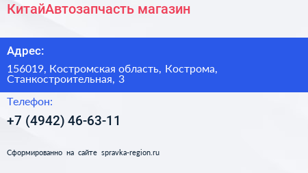 КитайАвтозапчасть, магазин по адресу 156019, Костромская область, Кострома, Станкостроительная, 3 в дальнейшем Организация, размещена в следующих категориях: