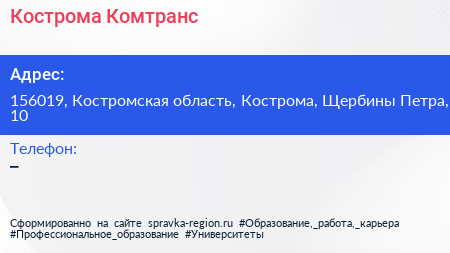 Кострома-Комтранс по адресу 156019, Костромская область, Кострома, Щербины Петра, 10 в дальнейшем Организация, размещена в следующих категориях: