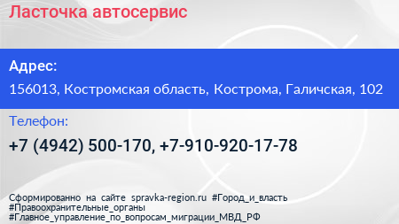 Ласточка, автосервис по адресу 156013, Костромская область, Кострома, Галичская, 102 в дальнейшем Организация, размещена в следующих категориях: