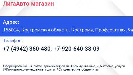 ЛигаАвто, магазин по адресу 156014, Костромская область, Кострома, Профсоюзная, 9а в дальнейшем Организация, размещена в следующих категориях: