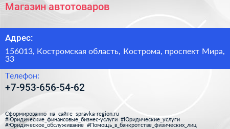 Магазин автотоваров по адресу 156013, Костромская область, Кострома, проспект Мира, 33 в дальнейшем Организация, размещена в следующих категориях: