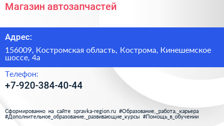 Магазин автозапчастей по адресу 156009, Костромская область, Кострома, Кинешемское шоссе, 4а в дальнейшем Организация, размещена в следующих категориях:
