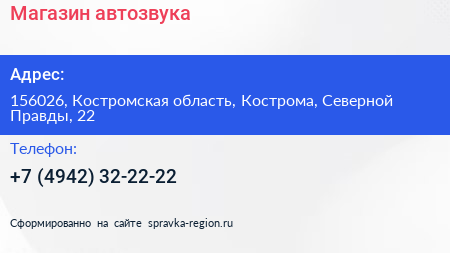 Магазин автозвука по адресу 156026, Костромская область, Кострома, Северной Правды, 22 в дальнейшем Организация, размещена в следующих категориях: