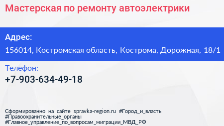 Мастерская по ремонту автоэлектрики по адресу 156014, Костромская область, Кострома, Дорожная, 18/1 в дальнейшем Организация, размещена в следующих категориях: