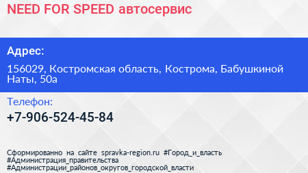 NEED FOR SPEED, автосервис по адресу 156029, Костромская область, Кострома, Бабушкиной Наты, 50а в дальнейшем Организация, размещена в следующих категориях: