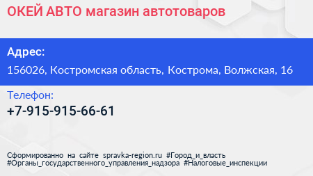 ОКЕЙ-АВТО, магазин автотоваров по адресу 156026, Костромская область, Кострома, Волжская, 16 в дальнейшем Организация, размещена в следующих категориях: