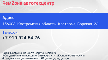 RемZона, автотехцентр по адресу 156003, Костромская область, Кострома, Боровая, 2/1 в дальнейшем Организация, размещена в следующих категориях:
