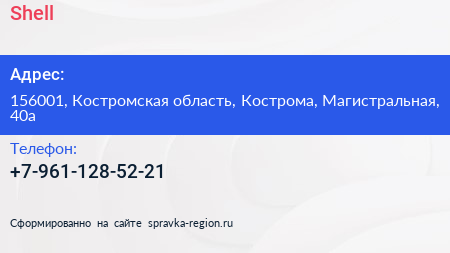 Shell по адресу 156001, Костромская область, Кострома, Магистральная, 40а в дальнейшем Организация, размещена в следующих категориях:
