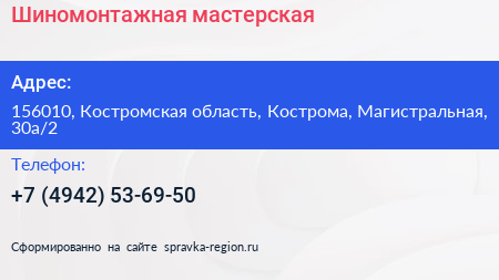 Шиномонтажная мастерская по адресу 156010, Костромская область, Кострома, Магистральная, 30а/2 в дальнейшем Организация, размещена в следующих категориях: