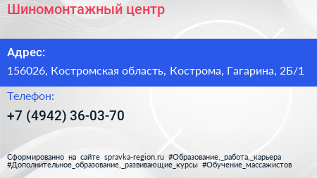 Шиномонтажный центр по адресу 156026, Костромская область, Кострома, Гагарина, 2Б/1 в дальнейшем Организация, размещена в следующих категориях: