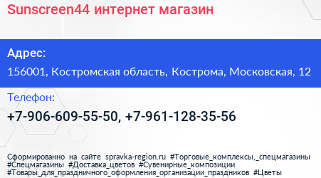 Sunscreen44, интернет-магазин по адресу 156001, Костромская область, Кострома, Московская, 12 в дальнейшем Организация, размещена в следующих категориях:
