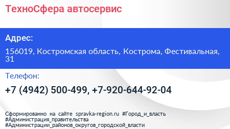 ТехноСфера, автосервис по адресу 156019, Костромская область, Кострома, Фестивальная, 31 в дальнейшем Организация, размещена в следующих категориях: