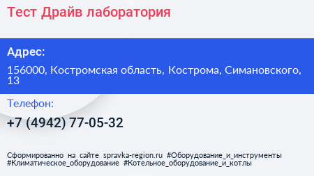 Тест-Драйв, лаборатория по адресу 156000, Костромская область, Кострома, Симановского, 13 в дальнейшем Организация, размещена в следующих категориях: