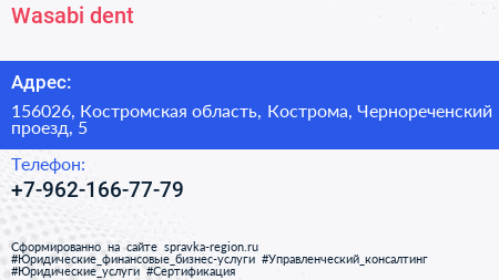 Wasabi-dent по адресу 156026, Костромская область, Кострома, Чернореченский проезд, 5 в дальнейшем Организация, размещена в следующих категориях: