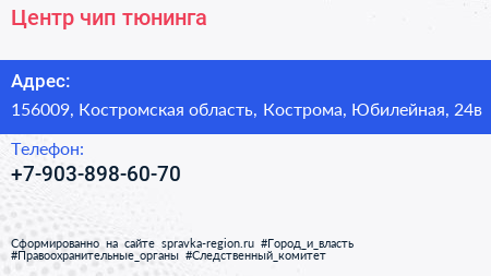 Центр чип-тюнинга по адресу 156009, Костромская область, Кострома, Юбилейная, 24в в дальнейшем Организация, размещена в следующих категориях:
