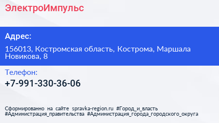 ЭлектроИмпульс по адресу 156013, Костромская область, Кострома, Маршала Новикова, 8 в дальнейшем Организация, размещена в следующих категориях: