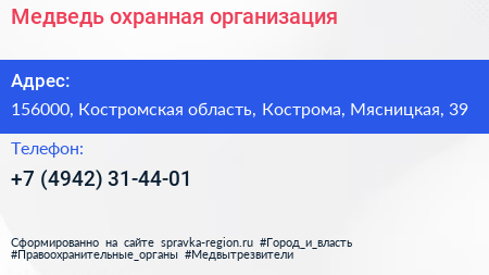 Медведь, охранная организация по адресу 156000, Костромская область, Кострома, Мясницкая, 39 в дальнейшем Организация, размещена в следующих категориях: