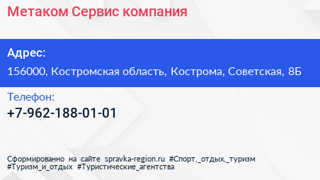 Метаком-Сервис, компания по адресу 156000, Костромская область, Кострома, Советская, 8Б в дальнейшем Организация, размещена в следующих категориях: