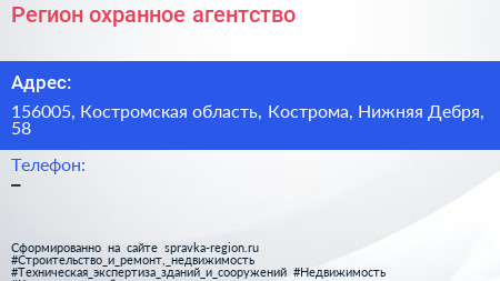 Регион, охранное агентство по адресу 156005, Костромская область, Кострома, Нижняя Дебря, 58 в дальнейшем Организация, размещена в следующих категориях: