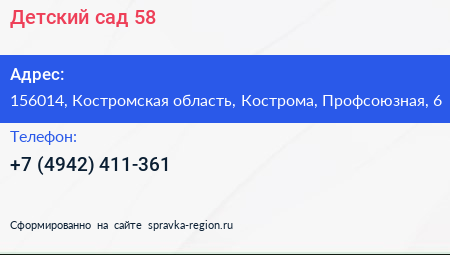 Детский сад №58 по адресу 156014, Костромская область, Кострома, Профсоюзная, 6 в дальнейшем Организация, размещена в следующих категориях: