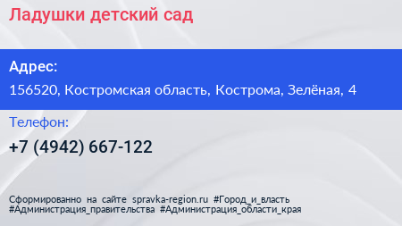 Ладушки, детский сад по адресу 156520, Костромская область, Кострома, Зелёная, 4 в дальнейшем Организация, размещена в следующих категориях: