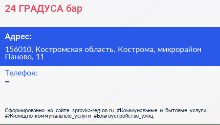 24 ГРАДУСА, бар по адресу 156010, Костромская область, Кострома, микрорайон Паново, 11 в дальнейшем Организация, размещена в следующих категориях: