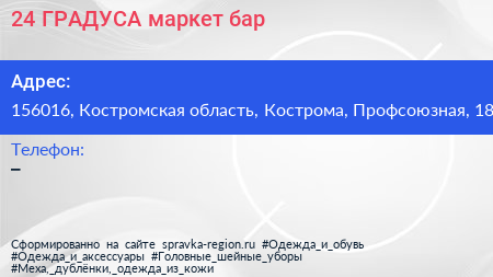 24 ГРАДУСА, маркет-бар по адресу 156016, Костромская область, Кострома, Профсоюзная, 18 в дальнейшем Организация, размещена в следующих категориях: