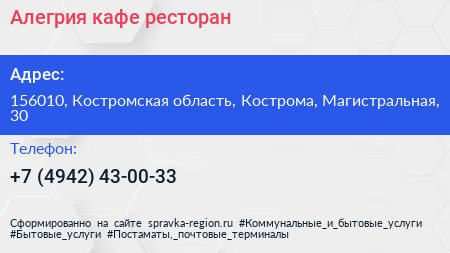 Алегрия, кафе-ресторан по адресу 156010, Костромская область, Кострома, Магистральная, 30 в дальнейшем Организация, размещена в следующих категориях:
