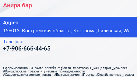Анира, бар по адресу 156013, Костромская область, Кострома, Галичская, 26 в дальнейшем Организация, размещена в следующих категориях: