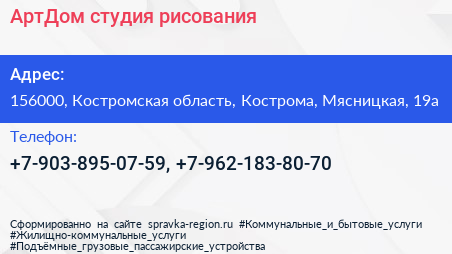 АртДом, студия рисования по адресу 156000, Костромская область, Кострома, Мясницкая, 19а в дальнейшем Организация, размещена в следующих категориях: