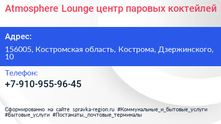 Atmosphere Lounge, центр паровых коктейлей по адресу 156005, Костромская область, Кострома, Дзержинского, 10 в дальнейшем Организация, размещена в следующих категориях: