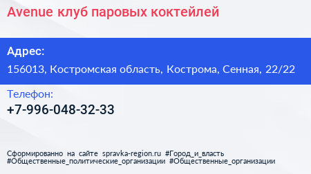 Avenue, клуб паровых коктейлей по адресу 156013, Костромская область, Кострома, Сенная, 22/22 в дальнейшем Организация, размещена в следующих категориях:
