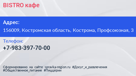 BISTRO, кафе по адресу 156009, Костромская область, Кострома, Профсоюзная, 3 в дальнейшем Организация, размещена в следующих категориях: