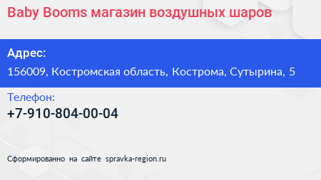 Baby Booms, магазин воздушных шаров по адресу 156009, Костромская область, Кострома, Сутырина, 5 в дальнейшем Организация, размещена в следующих категориях: