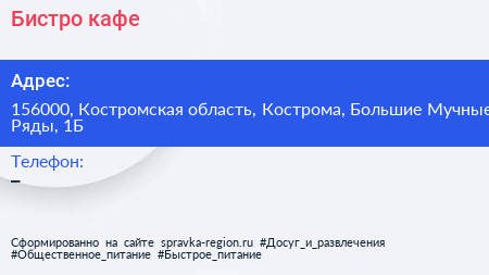 Бистро, кафе по адресу 156000, Костромская область, Кострома, Большие Мучные Ряды, 1Б в дальнейшем Организация, размещена в следующих категориях:
