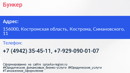 Бункер по адресу 156000, Костромская область, Кострома, Симановского, 11 в дальнейшем Организация, размещена в следующих категориях: