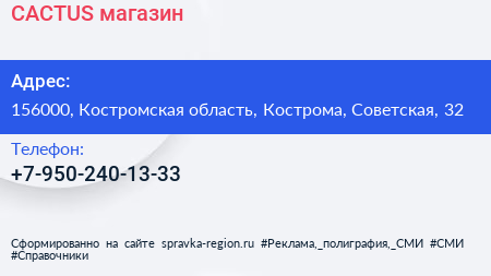 CACTUS, магазин по адресу 156000, Костромская область, Кострома, Советская, 32 в дальнейшем Организация, размещена в следующих категориях: