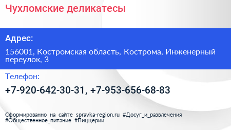 Чухломские деликатесы по адресу 156001, Костромская область, Кострома, Инженерный переулок, 3 в дальнейшем Организация, размещена в следующих категориях:
