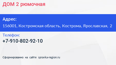 ДОМ 2, рюмочная по адресу 156001, Костромская область, Кострома, Ярославская, 2 в дальнейшем Организация, размещена в следующих категориях: