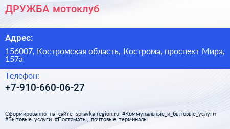 ДРУЖБА, мотоклуб по адресу 156007, Костромская область, Кострома, проспект Мира, 157а в дальнейшем Организация, размещена в следующих категориях: