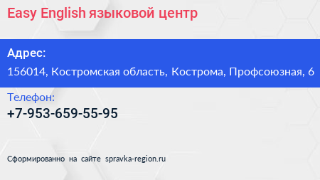 Easy English, языковой центр по адресу 156014, Костромская область, Кострома, Профсоюзная, 6 в дальнейшем Организация, размещена в следующих категориях: