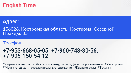 English Time по адресу 156026, Костромская область, Кострома, Северной Правды, 35 в дальнейшем Организация, размещена в следующих категориях: