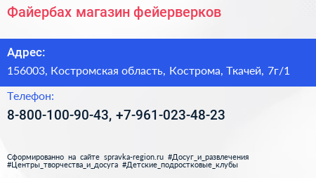 Файербах, магазин фейерверков по адресу 156003, Костромская область, Кострома, Ткачей, 7г/1 в дальнейшем Организация, размещена в следующих категориях: