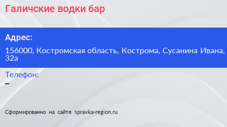 Галичские водки, бар по адресу 156000, Костромская область, Кострома, Сусанина Ивана, 32а в дальнейшем Организация, размещена в следующих категориях: