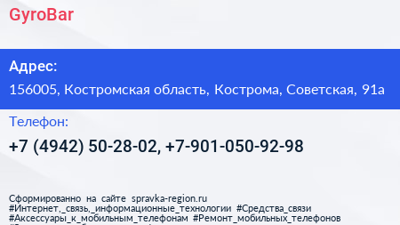 GyroBar по адресу 156005, Костромская область, Кострома, Советская, 91а в дальнейшем Организация, размещена в следующих категориях: